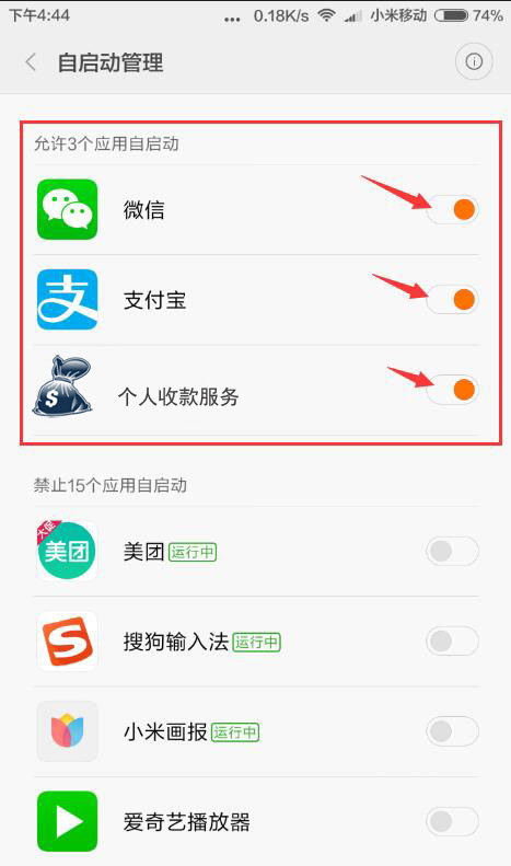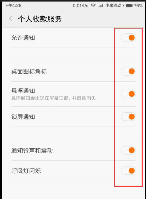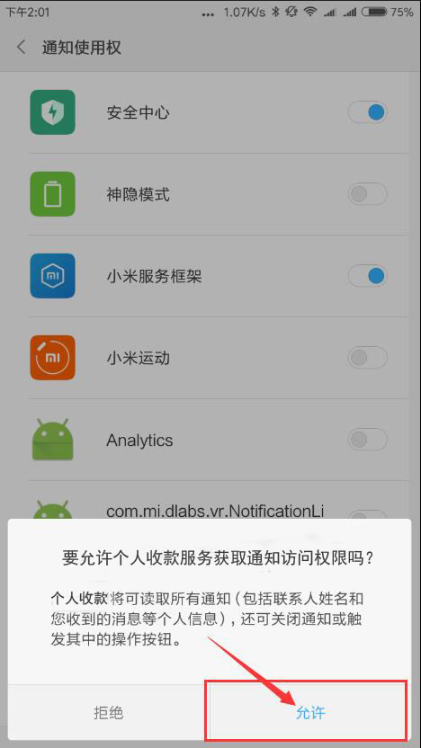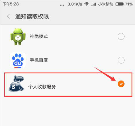 初次安装App后打开,会自动跳转到通知使用权页,找到个人收款服务,并开启。