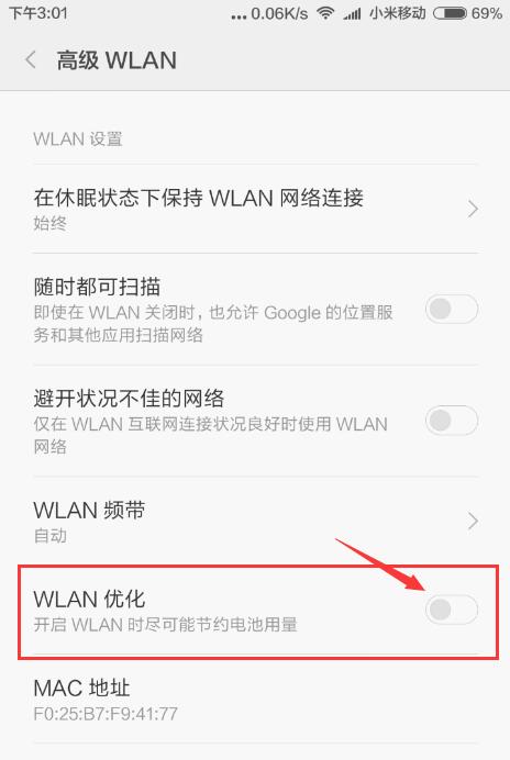 部分旧的MIUI系统有此选项:系统【设置】 - 【WLAN】 -【高级设置】 -【WLAN优化】,关闭它。