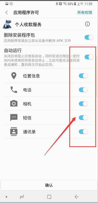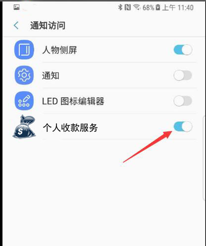 初次安装App后打开,会自动跳转到通知使用权页,找到个人收款服务,并开启。