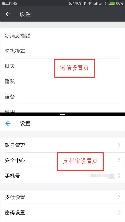 用一台支持分屏功能的旧手机,让支付宝和微信运行在前台,各占一半屏幕。让支付宝和微信的界面都进入设置界面(不要停留在首页,会导致不通知)
